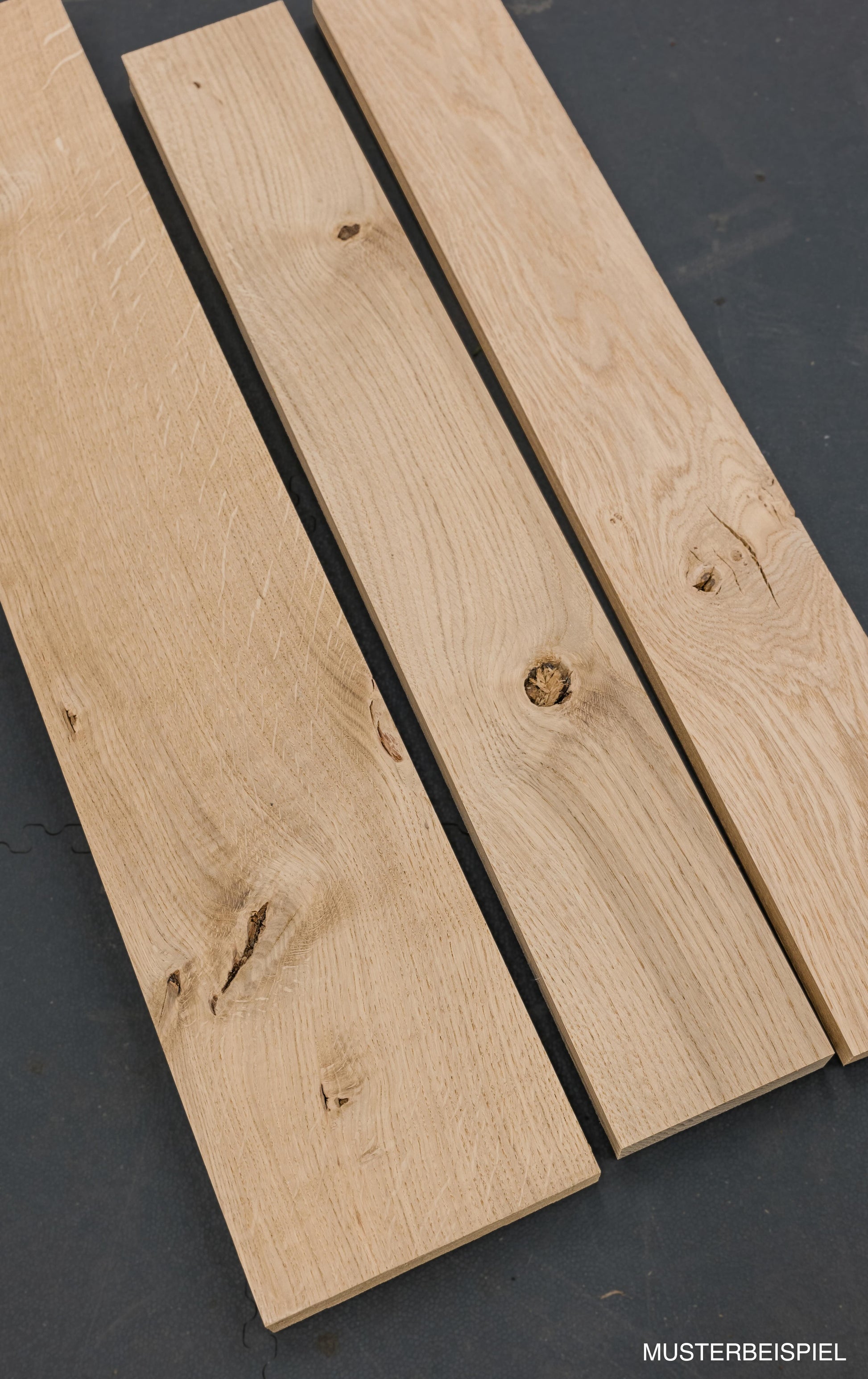 Im Gegensatz zu unserer A-Ware sind die gehobelten Hölzer der B-Ware nicht so gerade und weisen von Anfang an einen leichten Verzug auf. Außerdem kann es sein, dass unser gehobeltes Eichenholz auch andere Unregelmäßigkeiten aufweist. Hierzu zählen lose Äste, leichte Risse (die häufig nur einseitig sind), kleine Verwindungen oder Farbvariationen. All das macht dein Projekt noch individueller.